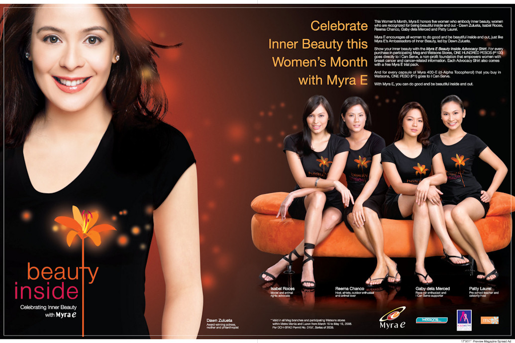 Celebrate Women's Month with Myra E by showing your inner beauty. Just like Dawn Zulueta, Isabel Roces, Reema Chanco, Gaby De La Merced, and Patty Laurel, you can be beautiful inside out. Buy the Myra E Beauty Inside Advocacy Shirt for P249.75 in participating Meg and Watsons Stores, and Myra E automatically donates P100 of the purchase price to ICanServe. Each Advocacy Shirt comes in a trendy canister with a free Myra E trial pack.