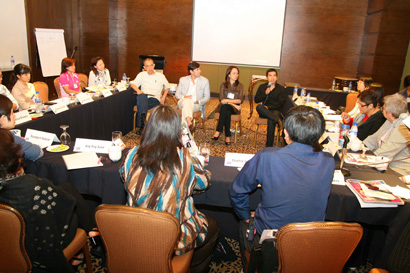 The "faculty" during the Project Communications Workshop left to right : Nestor Cuartero, journalist, Justin Rogers, ACS VP Corp Communications, Kara, ICS & Don Sevilla, Exec Creative Director, Publicis Jimenez Basic during the Q & A with the Pfizer grantees from 5 countries in Asia . |