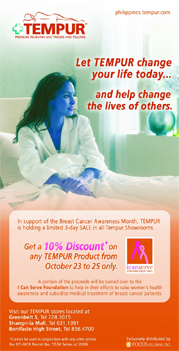 October is Breast Cancer Awareness Month. Visit the ICanServe Foundation booth at P1 of Power Plant Mall on October 15-17; 22-24; 29-31. Have your pick of awareness bands, charm bracelets, Rapt 360 headwear, tote bags, hotfoil t-shirts, hooded jackets. Also available are men's and kid's t-shirts and DVDs on breast self-examination.